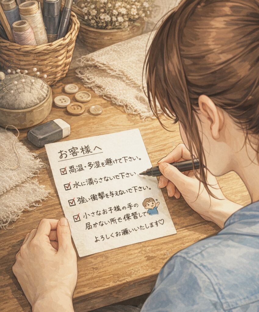 注意点を明記した、注意書き同封するなどして、事故防止と制作者としての責任を果たすことが重要になってきます。
